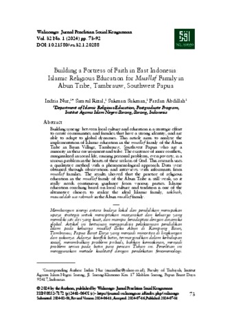 Nur, Indria and Sukman, Sukman and Rizal, Samsul and Abdillah, Fardan (2024) Building a Fortress of Faith in East Indonesia: Islamic Religious Education for Muallaf Family in Abun Tribe, Tambrauw, Southwest Papua. Walisongo: Jurnal Penelitian Sosial Keagamaan, 32 (1). pp. 73-92. ISSN 2461-064X