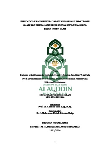 Ikram, Muhammad Furqanul (2024) Implementasi Kaidah Fikih Al-Adatu Muhakkamah pada Tradisi Manre Ade’ di Kecamatan Sinjai Selatan Serta Tinjauannya dalam Hukum Islam. Magister (S2) thesis, Universitas Islam Negeri Alauddin Makassar.