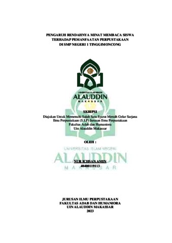 Amin, Nur Ichsan (2023) Pengaruh Rendahnya Minat Membaca Siswa Terhadap Pemanfaatan Perpustakaan di SMP Negeri 1 Tinggimoncong. Undergraduate (S1) thesis, Universitas Islam Negeri Alauddin Makassar.