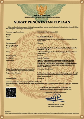 Siradjuddin; Rusnawati; Imaniar Nur Fajriyany (2024) Peran Kepempimpinan Transformasional dalam Memediasi Perceived Organization Support, Employee Engagment, dan Kompetensi terhadap Kinerja Pegawai pada PTKIN di Sulawesi Selatan (Kasus IAIN Parepare). EC002024218497.