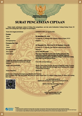 Hasbullah; Muslimin (2025) Penerapan Nilai-nilai Syariah pada Kualitas Pelayanan dan Reputasi Perusahaan yang Berpengaruh terhadap Kepuasan Nasabah Melalui Keputusan Menabung sebagai Variabel Intervening pada Bank Syariah Sulawesi Barat. EC002025115877.