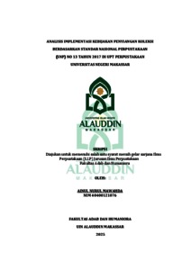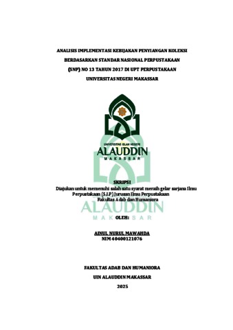 Mawahda, Ainul Nurul (2025) Analisis Implementasi Kebijakan Penyiangan Koleksi Berdasarkan Standar Nasional Perpustakaan (SNP) No. 13 Tahun 2017 di UPT Perpustakaan Universitas Negeri Makassar. Undergraduate (S1) thesis, Universitas Islam Negeri Alauddin Makassar.