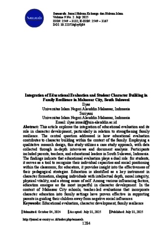 Ilyas, Ilyas and Suriyani, Suriyani (2025) Integration of Educational Evaluation and Student Character Building in Family Resilience in Makassar City, South Sulawesi. Samarah; Jurnal Hukum Keluarga dan Hukum Islam. ISSN p-ISSN 2549-3132 e-ISSN 2549-3167