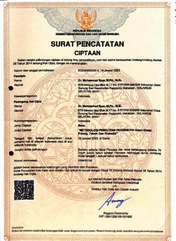 Dr. Muhammad llyas Ismail, M.Pd., M.Si. (2023) Metodologi Penelitian Pendidikan: Dasar-Dasar, Prinsip, Teknik dan Prosedur. EC00202302810.