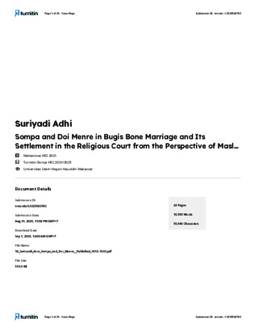 Asni, Asni and Tarmizi, Tarmizi and Arisyanti, Arisyanti and Kurniati, Kurniati (2025) Sompa and Doi Menre in Bugis Bone Marriage and Its Settlement in the Religious Court from the Perspective of Maslahah. Samarah; Jurnal Hukum Keluarga dan Hukum Islam, 9 (2). ISSN p-ISSN 2549-3132 e-ISSN 2549-3167