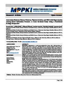 Alam, Syamsul and Habibi, Habibi and Nildawati, Nildawati and Syarfaini, Syarfaini and Nurfaidah, Nurfaidah and Syarif, Isymiarni (2025) Association Between Dietary Patterns, Physical Activity, and BMI with Hypertension Among Rural Indonesian Farmers: A Cross Sectional Study Using a Nutritional Ecology Perspective. MPPKI: Media Publikasi Promosi Kesehatan Indonesia The Indonesian Journal of Health Promotion, 8 (8). pp. 609-620. ISSN 2597-6052